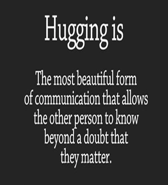 Healthline.com research shows that hugging may help reduce stress and lower your risk of anxiety, depression and illness. … Consider what a simple hug can do: It helps you feel connected; hugging helps reduce feelings of loneliness and isolation. There are studies that show that a 15 – 20 second hug reduces the harmful, physical effects of stress, including its impact on your blood pressure and heart rate. That’s because prolonged hugging releases oxytocin, a powerful hormone in the brain.